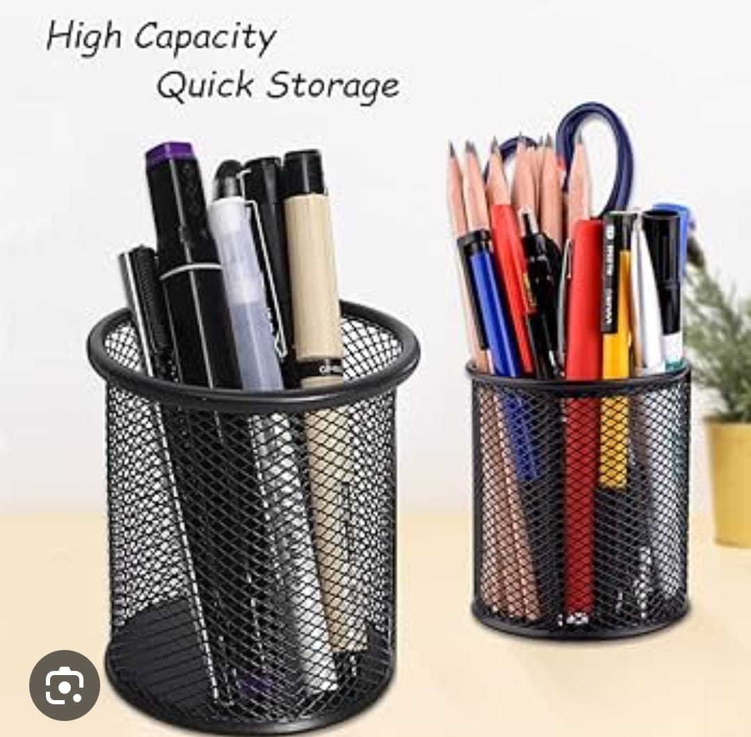 DESKTOP ORGANIZER: Easy to access, save time to find your pen or pencils, always keep your desk tidy and organized. And it enables you to improve your working efficiency. That blends in with any office or home décor. 1. The desktop storage cup is big enough to store all your office supplies like pens, pencils, rulers, scissors, markers, etc. 2. It can be used as a pen holder, as well as a storage bucket and a cosmetic bucket, to store makeup brushes, etc. 3. Size: (L×H) Circle: 3.5×3.9in 4. Metal mesh format design, high temperature paint steel, you need a pen holder to save your desktop