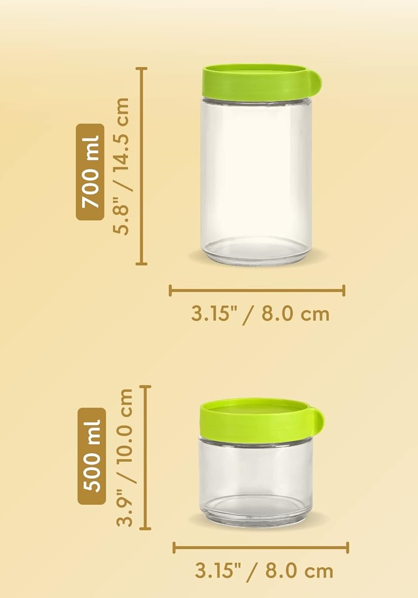 π Don’t settle for subpar food storage containers in your home. Our borosilicate glass containers are designed to last a lifetime and do not leach any chemicals into your food. They are the best choice for you and your family. These glass food storage jarsβ lids have an air-tight seal and keep food fresh longer. They are great for wet or dry foods, baking goods, cookies, cereals, loose-leaf tea, and spices or other ingredients. π What Youβd Get in this Pack: Our Spice Jars are made of high-quality, lead-free, long-lasting glass. The pack contains 2 cylindrical jars: 500ml (10x8cm), 700ml (14.5x8cm). The cylinder shape and tops complement any spice rack, cabinet, organizer, drawer, or kitchen. π BPA Free & Food Safe: These glasses are BPA-free and completely food safe. The silicone-based plastic lids are airtight and spill-proof. These glass pantry containers each have a sturdy lid seal that safeguards your food during long-term storage. Your food and your canisters are kept safe because it creates a tight closure without scratching the glass. π Reusable, Versatile & Multipurpose: These clear glass spice jars are ideal for storing spices, candy, rice, cookies, flour, sugar, salt, pepper, herbs, seasoning containers, spaghetti, small arts and crafts accessories, and other homemade gifts. These kitchen canisters can be stacked to save space and prevent cabinet clutter when space is limited. π Easy to Clean: They are simple to clean; simply scrub, rinse, and place them somewhere warm to dry before filling the jar with the prepared commodity. You can also turn them over so that the water drains all the way to the bottom of the jar. Handwashing is recommended for increased longevity.